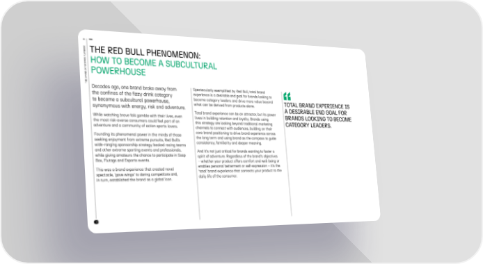 2 K O O B THE RED BULL PHENOMENON: Y A PL CE N HOW TO BECOME A SUBCULTURAL E I PER X E D POWERHOUSE N A R B E H T Decades ago, one brand broke away from Spectacularly exemplified by Red Bull, total brand the confines of the fizzy drink category experience is a desirable end goal for brands looking to to become a subcultural powerhouse, become category leaders and drive more value beyond TOTAL BRAND EXPERIENCE IS what can be derived from products alone. synonymous with energy, risk and adventure. A DESIRABLE END GOAL FOR Total brand experience can be an attractor, but its power While watching brave folk gamble with their lives, even lives in building retention and loyalty. Brands using BRANDS LOOKING TO BECOME the most risk-averse consumers could feel part of an this strategy are looking beyond traditional marketing CATEGORY LEADERS. adventure and a community of action sports lovers. channels to connect with audiences, building on their Founding its phenomenal power in the minds of those core brand positioning to drive brand experience across seeking enjoyment from extreme pursuits, Red Bull’s the long term and using brand as the compass to guide wide-ranging sponsorship strategy backed racing teams consistency, familiarity and deeper meaning. and other extreme sporting events and professionals, And it’s not just critical for brands wanting to foster a while giving amateurs the chance to participate in Soap spirit of adventure. Regardless of the brand’s objectives Box, Flutags and Esports events. –whether your product offers comfort and well-being or This was a brand experience that created novel enables personal betterment or self-expression – it’s the spectacle, ‘gave wings’ to daring competitors and, ‘total’ brand experience that connects your product to the in turn, established the brand as a global icon. daily life of the consumer.