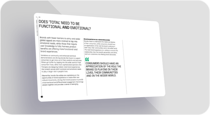 9 K O O B D OES ‘TOTAL’ NEED TO BE Y A PL CE N FUNCTIONAL AND EMOTIONAL? E I PER X E D N A R B E H T Brands with fewer barriers to entry and wider Brand experience as a relationship builder global appeal are more inclined to tap into Brands need to understand the needs and desires emotional needs, while those that require of their consumers, while consumers should have an appreciation of the role the brand is playing in user knowledge to fully harness product their lives, their communities and in the wider world. benefits are offering more functional total The total brand experience is a vehicle to nurture this brand experiences. relationship, hero the brand’s personality and ethos, and turn customers into lifelong brand advocates. Variations on community and enhanced technical demonstrations are driving brands like Dyson to support consumers to get more out of their products and services. Others go further by tapping into the wider world of their CONSUMERS SHOULD HAVE AN consumers’ lives, while more sophisticated operators like APPRECIATION OF THE ROLE THE Pampers are designing holistic total brand experiences that stretch across both functional and emotional needs BRAND IS PLAYING IN THEIR to play a larger role in people’s lives. LIVES, THEIR COMMUNITIES Meanwhile, brands like adidas are capitalising on the AND IN THE WIDER WORLD. opportunities of brand experience to create their own cultural movements, driving their brand purpose to provide unconventional and differentiated engagement that brings people together and provides a sense of belonging.