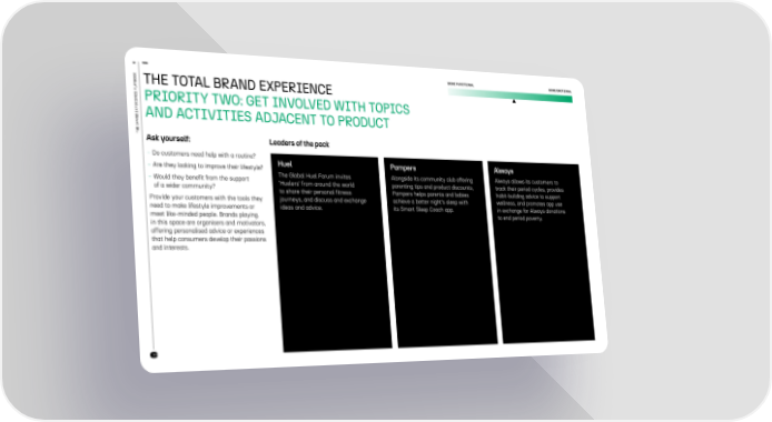 6 MORE FUNCTIONAL MORE EMOTIONAL K O O B THE TOTAL BRAND EXPERIENCE Y A PL CE N PRIORITY TWO: GET INVOLVED WITH TOPICS E I PER X E D AND ACTIVITIES ADJACENT TO PRODUCT N A R B E H T Ask yourself: Leaders of the pack - Do customers need help with a routine? - Are they looking to improve their lifestyle? Huel Pampers Always - Would they benefit from the support The Global Huel Forum invites Alongside its community club offering Always allows its customers to of a wider community? ‘Huelers’ from around the world parenting tips and product discounts, track their period cycles, provides to share their personal fitness Pampers helps parents and babies habit-building advice to support Provide your customers with the tools they journeys, and discuss and exchange achieve a better night’s sleep with wellness, and promotes app use need to make lifestyle improvements or ideas and advice. its Smart Sleep Coach app. in exchange for Always donations meet like-minded people. Brands playing to end period poverty. in this space are organisers and motivators, offering personalised advice or experiences that help consumers develop their passions and interests.