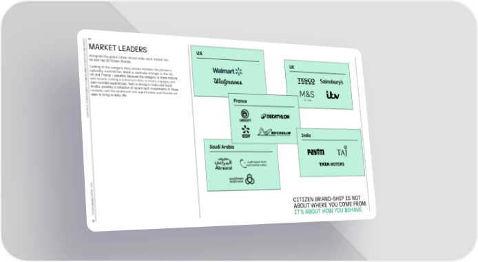 MARKET LEADERS US Alongside the global Citizen Brand index, each market has UK its own top 20 Citizen Brands. Looking at the category story across markets, the picture is culturally nuanced too. Retail is relatively stronger in the US, UK and France – possibly because the category is more mature with brands making a concerted effort to create engaging and well-rounded experiences. Tech is strong in India and Saudi Arabia, possibly a reflection of recent tech investments in these markets, and the excitement and opportunities such brands are seen to bring to daily life. France CHAPTER 02: CITIZEN BRANDS: FINDING BALANCE BETWEEN SELF AND SOCIETY India Saudi Arabia 4 202 CITIZEN BRAND-SHIP IS NOT CITIZEN BRANDS REPORT ABOUT WHERE YOU COME FROM. IT’S ABOUT HOW YOU BEHAVE. 18