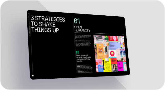 4 E R A C H T L A E 3 STRATEGIES 01 R H E M U S N O N CTO SHAKE OPEN N I O I T N E V HUMANITY N K COTHINGS UP A E R O B This is all about heart. Where consumer W T health has typically been cold, detached O H and clinical, these brands are warm, human and personal. They major on harmony, empathy and empowerment. Most disruptive of all, they create a space that allows for joy and play. Their efficacy promise is a simple one: ‘Trust us, we’ll make you feel better’. Warm, human and personal, these brands create a space for joy and play. Leading examples include acne brand Starface with its playful neon yellow packaging and bubbly typography, or Zing toothpaste with its quietly joyful nostalgic look. But we can also see glimmers of it in Femfresh wipes’ tropical illustrations, bringing warmth and a smile to their pack.