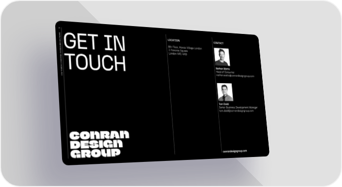 11 E R LOCATION CONTACT A C H T L A E 8th Floor, Havas Village London R H E 3 Pancras Square M U S GET IN N London N1C 4AG O N C N I O I T N E V N Nathan Watts K CO A E Head of Consumer R TOUCH O B [email protected] W T O H Tom Dodd Senior Business Development Manager [email protected] conrandesigngroup.com