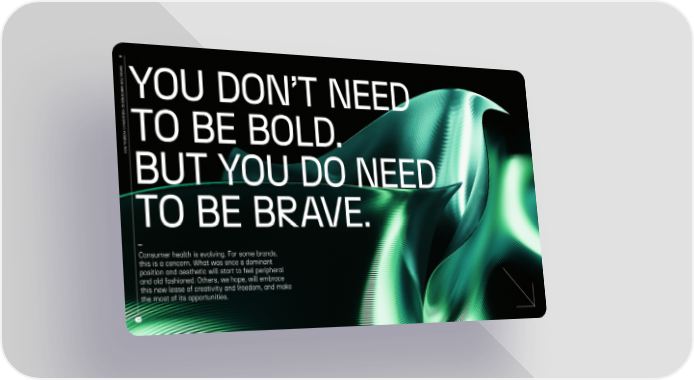 8 E R A C H T L A E R H E M U S YOU DON’T NEED N N CO N I O I T N E V N K CO A E R TO BE BOLD. O B W T O H BUT YOU DO NEED TO BE BRAVE. Consumer health is evolving. For some brands, this is a concern. What was once a dominant position and aesthetic will start to feel peripheral and old fashioned. Others, we hope, will embrace this new lease of creativity and freedom, and make the most of its opportunities.